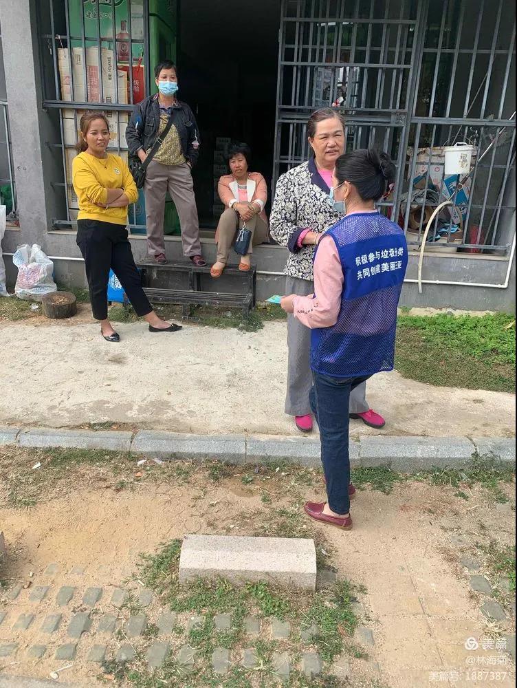 吉陽環(huán)衛(wèi)垃圾分類督導(dǎo)員與社區(qū)工作人員對居民分發(fā)垃圾分類手冊