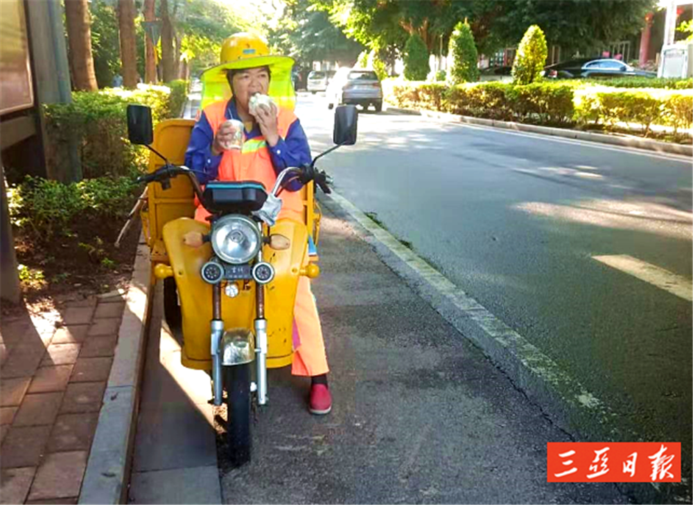 早上常常來不及在家里吃早餐,藍(lán)亞燕會(huì)帶著微燙的早餐來上班,等清理一段路后,才會(huì)吃上一口,而此時(shí)早餐往往已經(jīng)涼了。如果累了,要么席地而坐休息幾分鐘,要么在她的“敞篷車”上休息一會(huì)。