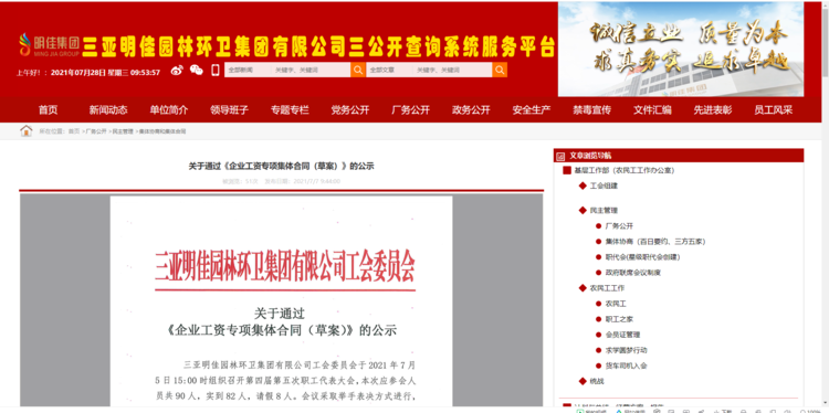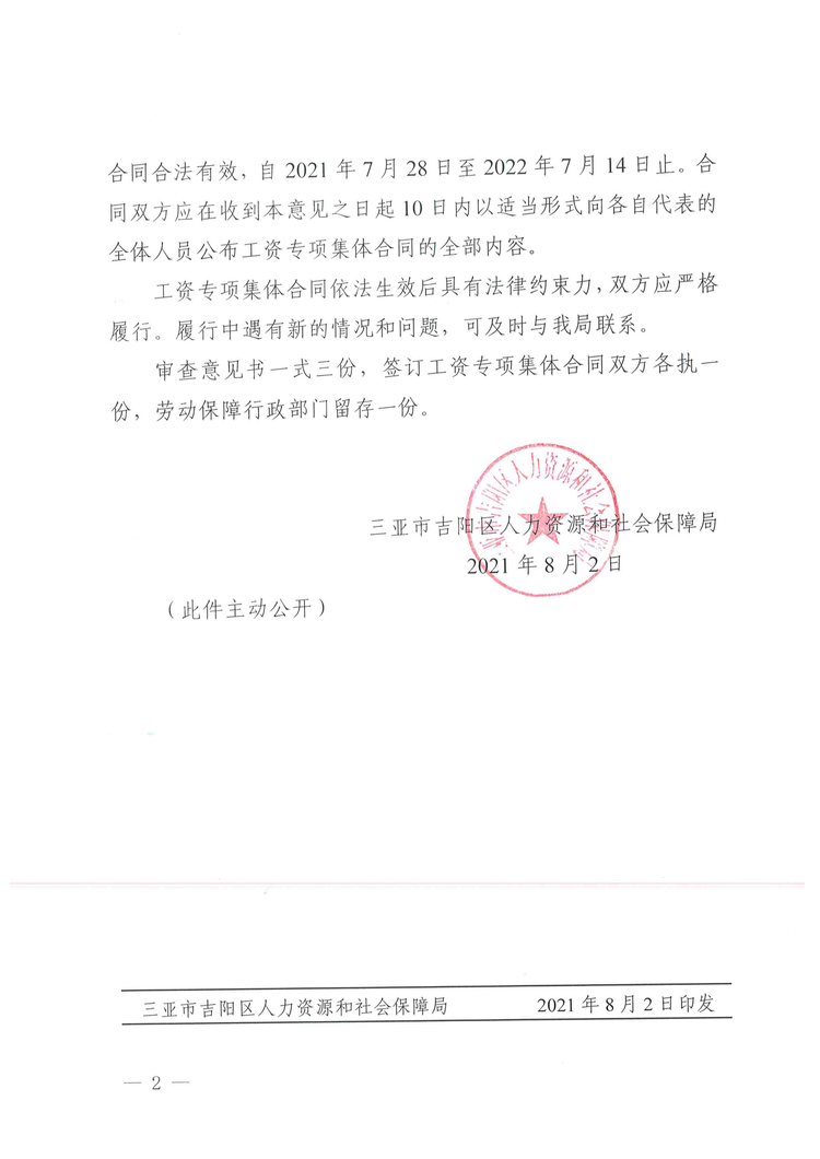2021年8月2日,吉陽(yáng)區(qū)人社局審查通過我公司《企業(yè)工資專項(xiàng)集體合同》。8月4日?qǐng)?bào)三亞市總工會(huì)基層工作部備案。至此,三亞明佳園林環(huán)衛(wèi)集團(tuán)有限公司2021年度企業(yè)工資集體協(xié)商工作圓滿結(jié)束。